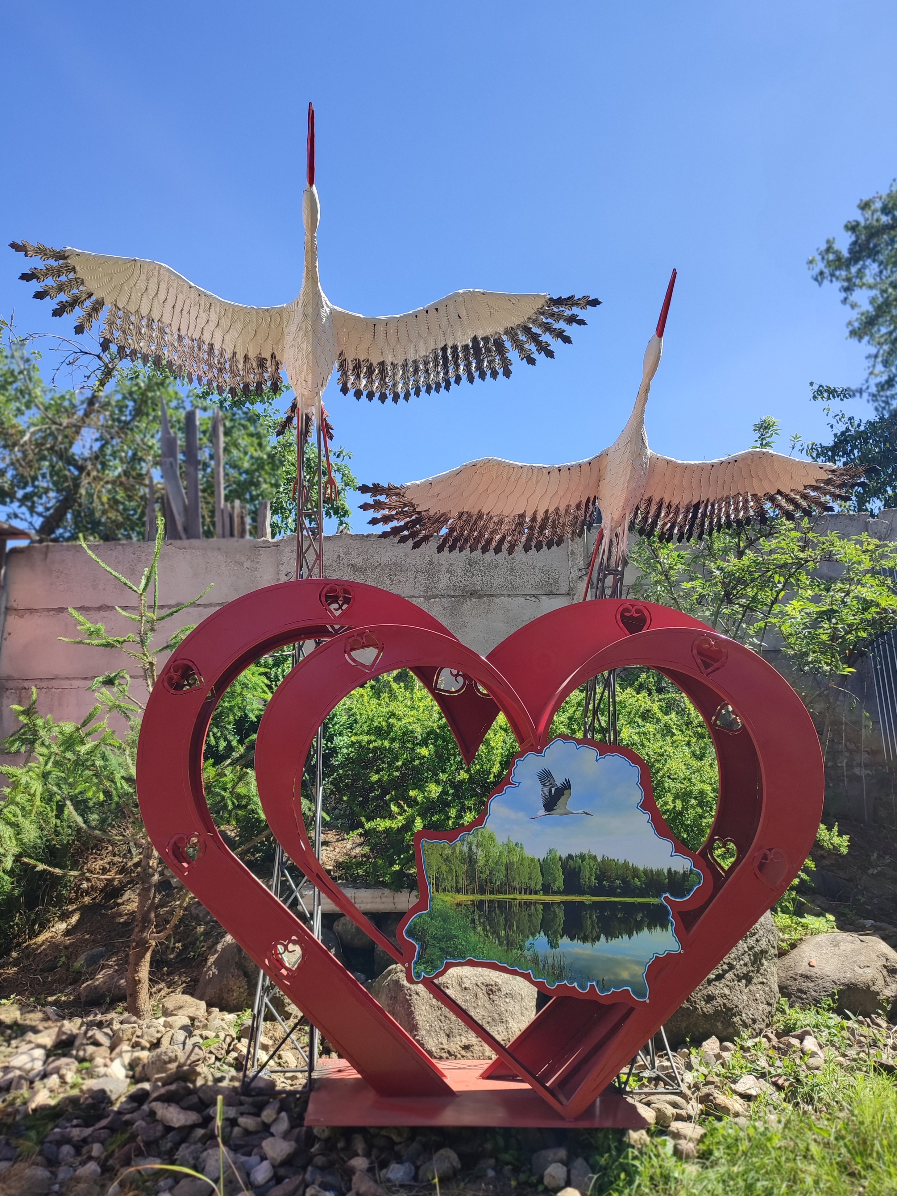 Композиция «С любовью Беларусь» это- объёмное двухуровневое сердце с картой Беларуси, дополненное двумя взлетающими аистами с детальной перьевой проработкой, высотой 3,5 метра, размах крыльев у птиц 1,5 метра.