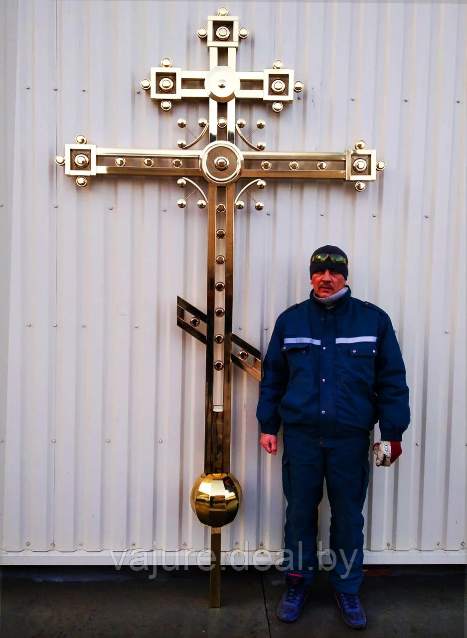 Купольный крест из нержавеющей стали с покрытием нитрид титана Высота креста с подкрестным яблоком 2,6 метра., ширина 1,5 метра.